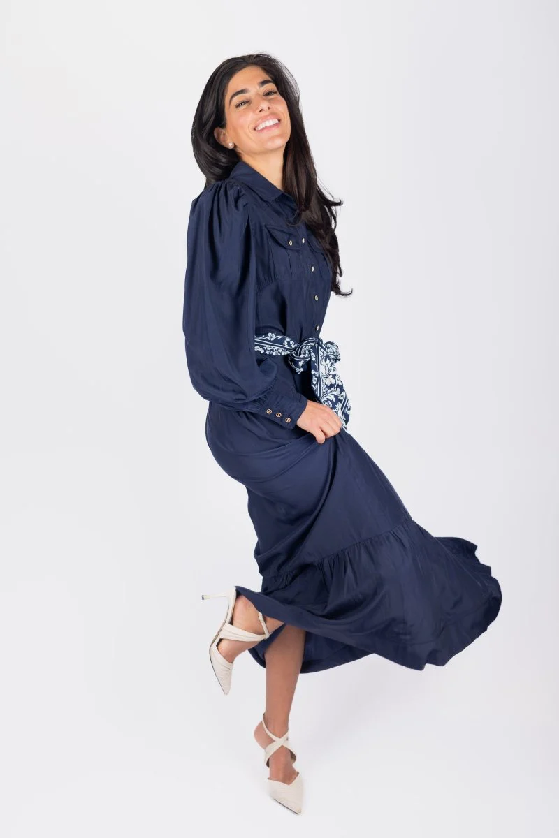 Elevate your wardrobe with this elegant navy maxi dress, featuring a classic button-down front with gold-tone buttons for a refined touch. The structured puff sleeves and collared neckline exude timeless sophistication, while the tiered hemline adds a hint of playful charm. A patterned sash belt cinches the waist, creating a flattering silhouette. Perfect for formal luncheons, dinner parties, or evening events, this dress pairs beautifully with heels or ankle boots for a polished look. Available in two lengths 41" and 53" for your modest preference.