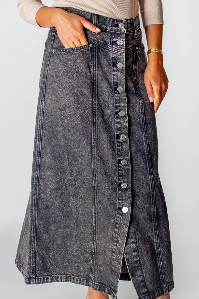 Welcome our new denim skirts to your everyday wardrobe. TheĀ Ariella is a beautiful black maxi skirt with an A-line silhouette and full button closure. Enjoy creating various outfits with this versatile and multi-seasonal piece. Move freely and modestly in this garment, and pair it with your favorite YB top or sweater!