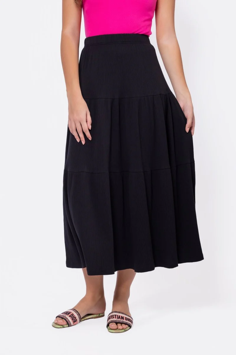 This black tiered maxi skirt is the perfect mix of comfort and style. Made from a soft, lightweight fabric with subtle texture, it features a flattering elastic waistband and tiered silhouette that moves with ease. Whether you pair it with a tee or a dressy blouse, itās a versatile piece you'll reach for all year long.
