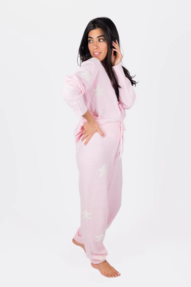 Drift off into dreamy comfort with this ultra-soft, plush pink pajama set. Featuring a relaxed-fit sweater and matching jogger-style pants adorned with delicate star details, this set is perfect for cozy nights in and lazy mornings. Made from a luxuriously fluffy fabric, itās designed to keep you warm, stylish, and oh-so-snuggly. A must-have for anyone who loves effortless comfort with a touch of charm!