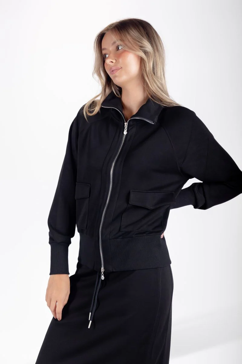 This sophisticated black jacket is the perfect blend of style and utility. Crafted from a soft, high-quality fabric, it features a zip-up front, a high collar for added warmth, and two functional flap pockets for practical yet chic storage. The ribbed cuffs and hem ensure a snug and flattering fit, making it an excellent choice for layering during cooler seasons. Perfect to match it with our Mina Skirt.
