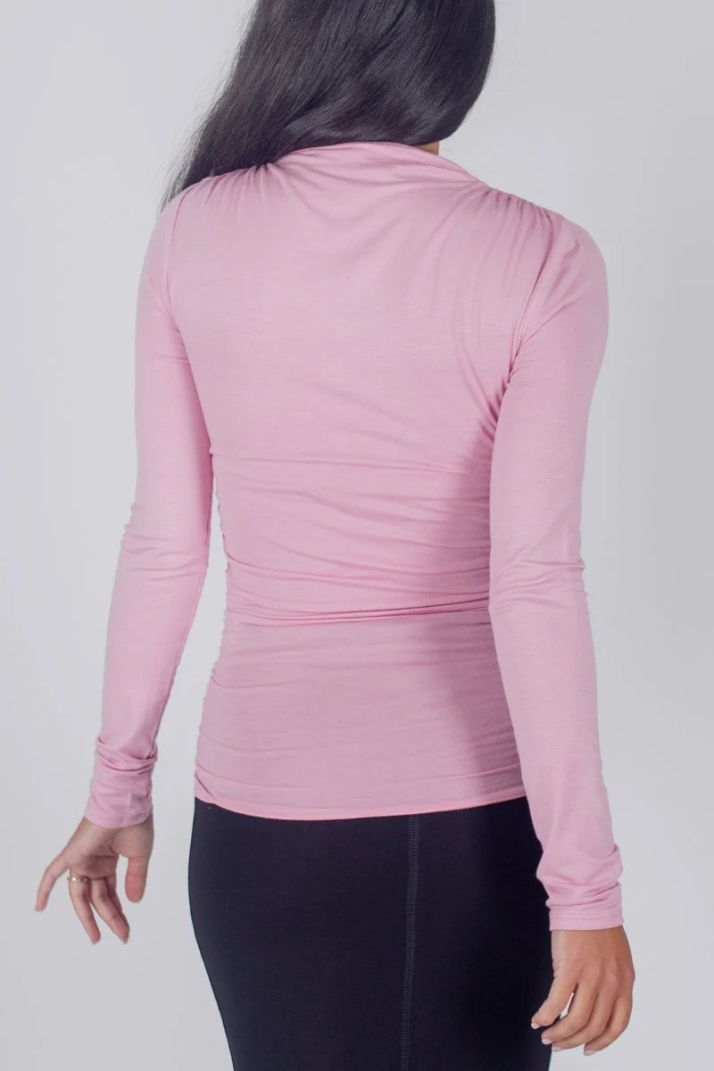 Are you looking for a top to elevate your outfit without sacrificing the comfort of our comfy tees?Ā Welcome theĀ Nicole into your wardrobe! Available in a variety of solids like this light pink. A new top that has a high surplice neckline and ruching on the side so you're staying up to date with the latest trends and maintaining a modest lifestyle while still flattering your natural figure.