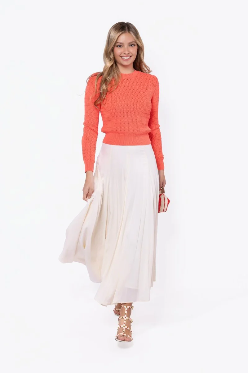 This Pointelle Knit Long-Sleeve Sweater in a warm apricot-coral is the ultimate "pick-me-up" piece for your transitional wardrobe. It combines a delicate, feminine texture with a vibrant, sun-kissed hue that flatters every skin tone.
