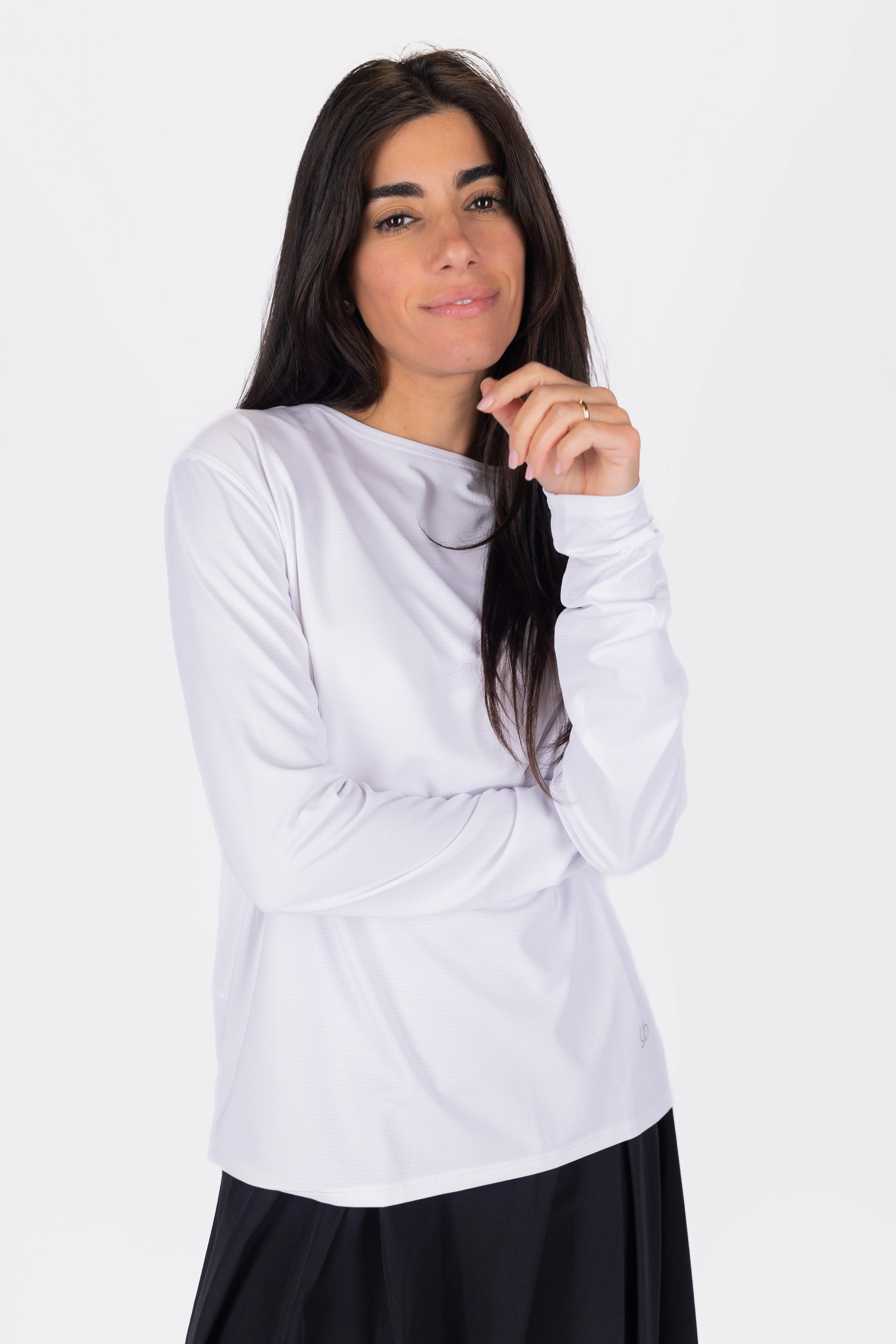 TheĀ Propel: an airy,Ā white round-hem top from our athleisure collection, crafted from recycled microfiber material.