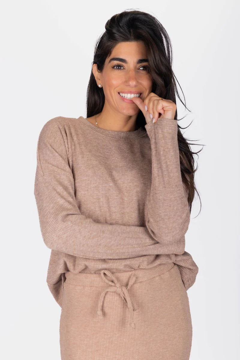 TheĀ Reese is a classic ribbed knit long sleeve. Now available in a hazelnut brown color. This comfortable fabric is perfect for chilly days. The casual t-shirt cut can be paired with any bottom to create a laid-back chic look.Ā